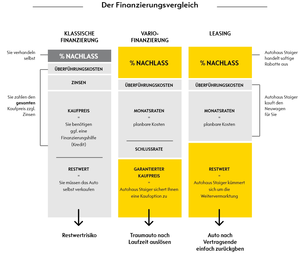 Die Staiger Vario-Finanzierung ist die neue und moderne Art der Autofinanzierung. Der Leasing-Kredit mit Kaufoption bietet Ihnen viele Freiheiten, da es die Vorteile der klassischen Finanzierung mit der Flexibilität des Leasings kombiniert. Im Vergleich zu anderen Finanzierungsmethoden müssen Sie nicht den gesamten Neuwagenpreis in hohen Raten bezahlen. Bei der Variofinanzierung bezahlen Sie lediglich den monatlichen Wertverlust. Zudem erhalten Sie hier einen großen Nachlass auf den Einkaufspreis und einen vor Laufzeitende ausgemachten und garantierten Kaufpreis für das Fahrzeug nach Laufzeitende. Das macht die Staiger Vario-Finanzierung zu einer cleveren und günstigen Autofinanzierung.